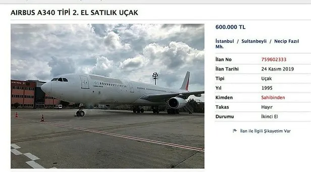 İstanbul Atatürk Havalimanı'nda park halinde bulunan Airbus A340 tipi uçak, sahibi tarafından internette 600 bin liradan satışa çıkarıldı. İlanda pazarlık ve takasın yapılamayacağı belirtildi..