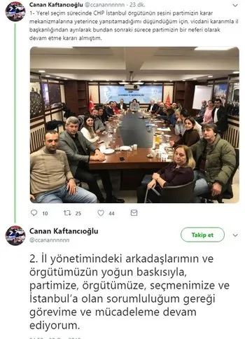 Cumhuriyet Halk Partisi (CHP) İstanbul İl Başkanı Canan Kaftancıoğlu, ilk önce neden istifa ettiğini, 'Yerel seçim sürecinde CHP İstanbul örgütünün sesini partimizin karar mekanizmalarına yeterince yansıtamadığımı düşündüğüm için, vicdani kararımla il başkanlığından ayrılarak bundan sonraki sürece partimizin bir neferi olarak devam etme kararı almıştım.' Tweet'i ile açıkladı.
