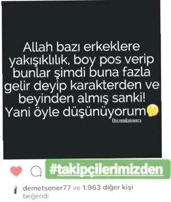 Şener'in beğendiği paylaşımda ise şu sözler yazılıydı: "Allah bazı erkeklere yakışıklılık, boy pos verip, bunlar şimdi buna fazla gelir deyip, karakterden ve beyinden almış sanki! Yani öyle düşünüyorum…".
