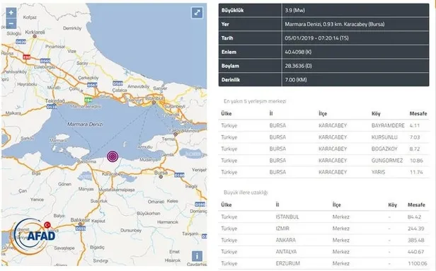 AFAD verilerine göre saat 07:20'de merkez üssü Marmara Denizi olan 3.9 büyüklüğünde deprem meydana geldi. Depreme en yakın yerleşim birimi, 4.11 kilometre ile Bursa Karacabey'e bağlı Bayramdere Köyü oldu.