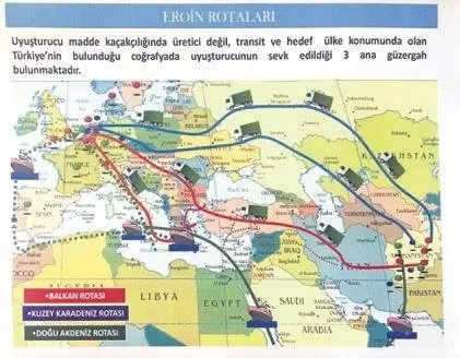 İstanbul Narkotik Şubesi, 40 sayfalık özel narkotik dosyasında yurt dışından gelen uyuşturucu kuryelerine ve yurt dışı uyuşturucu rotalarına da yer verdi. Uyuşturucu madde kaçakçılığında üretici değil, transit ve hedef ülke olduğu belirtilen ülkemizin bulunduğu coğrafyada uyuşturucu maddelerin sevk edildiği üç ana güzergah olduğu ifade ediliyor. Raporda yer verilen haritalara göre eroin ağırlıklı üç ana güzergahı Balkan rotası, Kuzey Karadeniz rotası ve Doğu Akdeniz rotası oluşturuyor. Captagon ve ecstasy başta olmak üzere uyuşturucu hapların ülkemize getirildiği rotalar ise 'sentetik rotası' olarak belirtilmiş. Operasyon verilerinden hareket eden narkotik polislerinin raporlarına göre; özellikle terör örgütü DEAŞ başta olmak üzere bazı terör örgütlerinin elemanlarına cesaret hapı olarak kullandırdığı captagon, ülkemize Doğu Avrupa ülkelerinden geliyor. Ortadoğu ülkelerine de transit olarak gönderiliyor. Belçika ve Hollanda başta olmak üzere bazı Batı Avrupa ülkelerinde üretilen ecstasy isimli uyuşturucu hap, çeteler tarafından Balkan rotasının tersi istikameti ile ülkemize getiriliyor. Raporda yer verilen son rotalar ise kokain... İncelemelere göre kokain maddeleri ülkemize Güney Afrika'dan hava yolu ile getiriliyor. Uyuşturucu çeteleri kokain sevkiyatı için deniz yoluyla Atlas Okyanusu- Akdeniz rotasını, kara yolu sevkiyatlarında ise yine Avrupa- Balkan rotasını kullanıyor