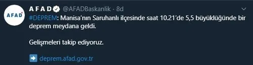 Manisa'de 5.5 büyüklüğünde deprem meydana geldi. Deprem İstanbul, Muğla ve İzmir gibi merkez illerde de hissedildi. Avrupa-Akdeniz Sismoloji Merkezi depremin büyüklüğünü 5.6 olarak verdi.