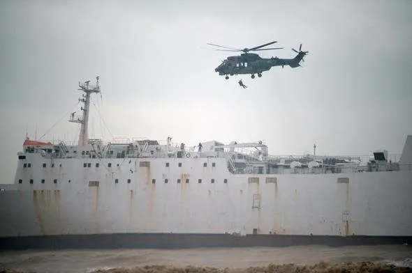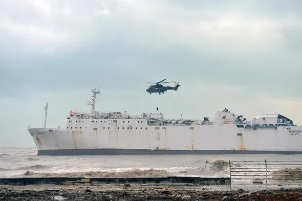 Bir bölümü yan yatan gemiye olumsuz hava koşulları nedeniyle deniz yolundan ulaşılamaması üzerine içindeki iki kişiyi kurtarmak için askeri helikopter havalandı..