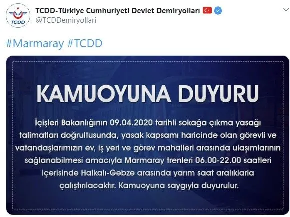 TCDD'nin sosyal medya hesaplarından yapılan açıklamada, "İçişleri Bakanlığının 09.04.2020 tarihli sokağa çıkma yasağı talimatları doğrultusunda, yasak kapsamı haricinde olan görevli ve vatandaşlarımızın ev, iş yeri ve görev mahalleri arasında ulaşımlarının sağlanabilmesi amacıyla Marmaray trenleri 06.00-22.00 saatleri içerisinde Halkalı-Gebze arasında yarım saat aralıklarla çalıştırılacaktır. Kamuoyuna saygıyla duyurulur." ifadelerine yer verildi.